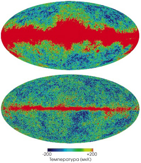 Микроволновое изображение неба получено спутником WMAP в K-полосе (23 ГГц, вверху), W-полосе (94 ГГц, внизу) и в трех других полосах спектра (не показаны). Полная небесная сфера в проекции представлена эллипсом, как географическая карта. Горизонтальная красная область – излучение Млечного Пути. Подобное излучение переднего плана изменяется с переходом от одной полосы спектра к другой, что позволяет отделять его от фонового реликтового излучения.