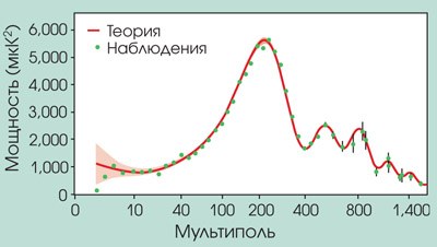 При анализе карт реликтового излучения каждый мультиполь $l$ имеет амплитуду $C_l$. Образно говоря, это средняя высота и глубина гор и долин, соответствующих этому мультиполю, или средняя громкость данного инструмента в оркестре. Полный набор амплитуд для всех возможных значений $l$ называется угловым спектром мощности. Космологи рисуют его в виде графика, который начинается с $C_2$, поскольку истинная информация о флуктуациях реликта начинаются с $l=2$. Иллюстрация «ЗАГАДКИ ОТ WMAP» показывает угловой спектр мощности, измеренный спутником WMAP, а также прогноз модели $I\Lambda CDM$, наиболее близко соответствующий этим наблюдениям. Измеренные амплитуды двух мультиполей с наименьшими значениями $l$, $C_2$ и $C_3$, называемых квадруполем и октуполем, значительно ниже модельных. Дефицит мощности у мультиполей с малыми $l$ впервые отметила команда COBE, а недавно подтвердили и специалисты WMAP. В терминах топографии: крупнейшие континенты и океаны оказались загадочно низкими и мелкими. В терминах музыки: мы еле слышим контрабас и тубу.