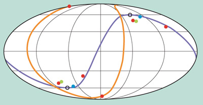 Квадруполь (синий) и октуполь (красный) должны быть ориентированы случайно, но вместо этого они тяготеют к точкам равноденствия (пустые кружки) и к направлению движения Солнечной системы, определенному осью диполя (зеленые точки). К тому же их оси лежат близ плоскости эклиптики (фиолетовая линия). А две из них находятся в плоскости Сверхгалактики, объединяющей нашу Галактику, соседние с ней звездные системы и их скопления (оранжевая линия). Вероятность случайного совпадения данных направлений – менее 1/10000