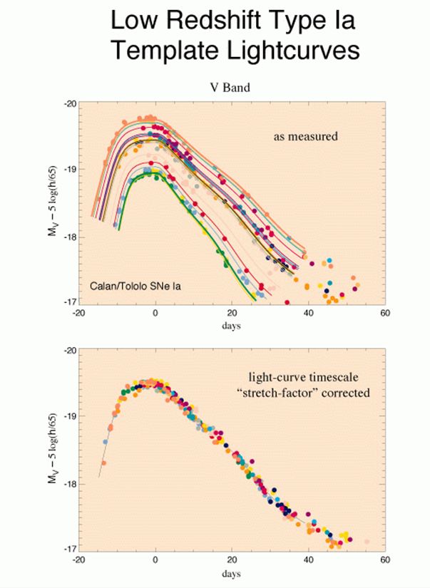 На рис. 1 показаны кривые светимости сверхновых. Из-за космической пыли светимость для разных звёзд разная. Как можно заметить из первого рисунка, вместе с уменьшением светимости, ускоряется угасание звезды. Данный факт был использован для корректировки графиков, и нахождения истинной светимости. На втором рисунке показаны откорректированные кривые, которые хорошо совпадают друг с другом. Это показывает, что сверхновые действительно хорошие стандартные свечи.