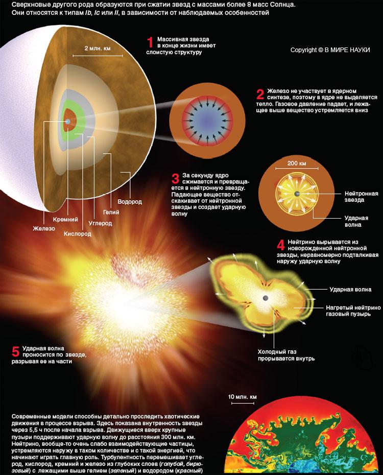 В такой теории есть недостаток — звезда должна взорваться полностью, а мы вместо этого наблюдаем нейтронные звёзды и чёрные дыры в качестве остатка. Есть другая версия. Все реакции прошли без неожиданностей, но ядро стало сжиматься. Уплотнению ядра могло способствовать потеря энергии из-за обильного излучения нейтрино и некоторые другие процессы, например диссоциация накопившихся ядер железа (диссоциация компенсирует нагревание при сжатии). По достижении критической плотности ядро коллапсирует в нейтронную звезду или чёрную дыру. Этот процесс протекает очень быстро, в течение менее чем одной секунды. Верхние слои начинают падать к центру, и, сильно сжимаясь, взрываются. Выбрасывается вещество в одну массу Солнца.