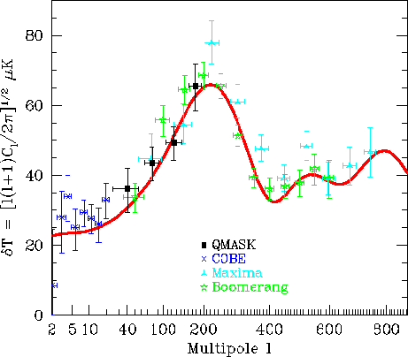 Рис. 2. Угловой спектр флюктуаций реликтового излучения по данным экспериментов BOOMERanG, MAXIMA и QMASK. Положение первого пика на $l = 200$ соответствует плоской геометрии пространственных сечений Вселенной (параметр $\Omega = 1 \pm 0,1$).