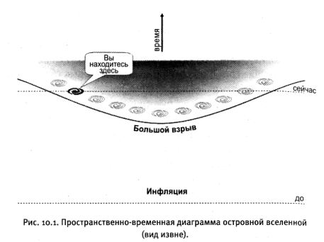 Пространство-время островной вселенной схематически изображено на рисунке 10.1. Вертикальное направление соответствует времени, а горизонтальное — одному из трех пространственных измерений; два других измерения опущены. Каждая горизонтальная линия — это мгновенный снимок вселенной в некоторый момент времени. Историю островной вселенной можно проследить, начиная с горизонтальной пунктирной линии, помеченной "до", в нижней части рисунка и постепенно двигаясь вверх. (Момент времени, соответствующий этой линии, относится к инфлирующей части пространства-времени, где островная вселенная еще не образовалась.) Толстая сплошная линия, помеченная словами "Большой взрыв", — это граница между островной вселенной и инфлирующей частью пространства-времени. Точка, отмеченная черной галактикой, — это "здесь и сейчас", а белыми галактиками обозначены области, где условия похожи на те, что сегодня мы наблюдаем вокруг себя. Горизонтальная пунктирная линия, помеченная сейчас", изображает настоящее время. Она соответствует островной вселенной с пустынным центральным регионом и областями звездообразования вблизи границ.