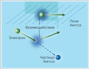 Два различных явления – приобретение массы частицей (сверху) и возникновение бозона Хиггса (снизу) – вызваны одним и тем же взаимодействием. Этот факт будет использован при экспериментальной проверке механизма Хиггса.