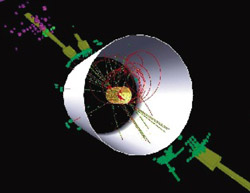 Возможно, что при столкновении позитрона высокой энергии и электрона в детекторе L3 Большого Электрон-Позитронного Коллайдера (LEP) в CERN возник бозон Хиггса. Линии представляют следы частиц. Зеленые и фиолетовые капли и золотые гистограммы изображают количества энергии, поглощенной в слоях детектора от улетающих из реакции частиц. Только объединяя множество таких событий, физики могут заключить, присутствовали ли бозоны Хиггса в некоторых из реакций или все события были произведены другими реакциями, которые лишь имитировали сигналы от бозонов Хиггса.
