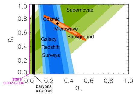 Из чего может быть построена $\Omega = 1$, так чтобы удовлетворить всему набору имеющихся наблюдений? В настоящее время наблюдения вспышек сверхновых, микроволнового космического фона (МКФ) и динамики образования крупномасштабных обеспечили ряд строгих условий на ${\Omega _m}$и${\Omega _{DE}}$ плотность материи и плотность темной энергии (в единицах критической плотности). Эти результаты согласуются между собой и обеспечивают$\left( {{\Omega _m},{\Omega _{DE}}} \right) \approx \left( {0.3,0.7} \right)$, как показано на рис.1. Количество материи в форме барионов (как светящихся, так и темных) также ограничено наблюдениями микроволнового космического фона и относительной распространенностью легких элементов вместе с теорией ядерного синтеза в рамках теории Большого Взрыва. Эти данные, рассмотренные совместно, оказываются впечатляюще согласованными, обеспечивая второй эшелон поддержки текущей Стандартной космологической модели. Если объединить все эти наблюдения, то плотность энергии небарионной темной материи (происхождение термина «темная материя» станет понятно ниже), барионов, темной энергии и излучения такова: