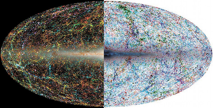 Распределение материи в современной Вселенной неоднородно на масштабах до примерно 100 мегапарсек (300 миллионов световых лет). Она выглядит как гигантская застывшая пена типа монтажной, используемой для установки окон: почти пустые пузыри (так называемые войды) и стенки. Откуда взялась эта структура? Ясно, что она — результат гравитационной неустойчивости — той же самой, что заставляет облака космического газа и пыли сгущаться в звезды. Задолго до открытия этой структуры Я.Б. Зельдович теоретически показал, что гравитационная неустойчивость в ранней Вселенной должна дать именно такую пену (пересекающиеся «блины» в терминологии Зельдовича с коллегами) в результате роста первоначальных возмущений плотности, неясен был только ее масштаб. Реальная картина прорисовалась только к концу 80-х, когда «пена» прорисовалась на трехмерных картах скоплений галактик по данным обзоров. Но главный вопрос оставался: из каких начальных возмущений сконденсировалась «пена» крупномасштабной структуры Вселенной?