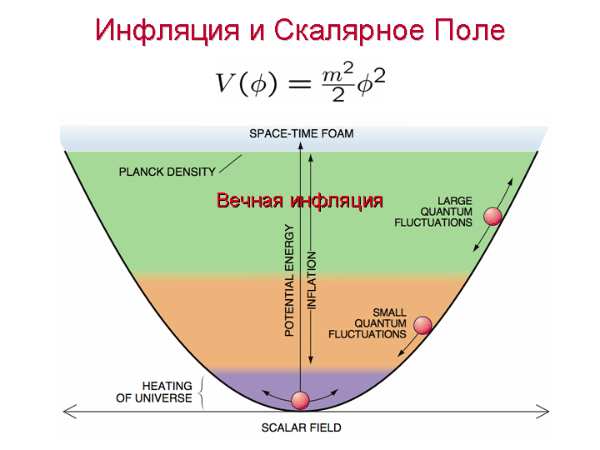 Скалярное поле в процессе инфляции ведет себя очень похожим образом. Поле бесцельно бродит вблизи вершины энергетической горы, пока не достигнет более крутой части. После этого оно скатывается вниз по направлению к концу инфляции. На плоской части, вблизи вершины изменение поля определяется квантовыми толчками и полностью случайно, в то время как скатывание по склону упорядоченно и предсказуемо, а квантовые толчки играют роль малого возмущения. Временной интервал между последовательными квантовыми толчками, грубо говоря, равен to удвоенному периоду инфляции (doubling time of inflation (DTI)). Это значит, что Mr. Field делает один шаг за DTI. И так как он делает много шагов в окрестности вершины горы, то фальшивому вакууму надо много DTI, чтобы распасться.