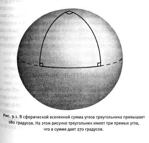 Вместо того чтобы полагаться на фридмановскую связь между геометрией Вселенной и ее плотностью, микроволновые наблюдения позволяют напрямую определить геометрию пространства — по сути, путем измерения суммы углов огромного узкого треугольника одна вершина которого находится на Земле, а две другие — в точках испускания микроволн, приходящих к нам от двух близких точек на небе. (Длинные стороны этих треугольников имеют сегодня протяженность около 40 миллиардов световых лет.) В плоском пространстве, как известно еще со школьных уроков геометрии, сумма углов должна составлять 180 градусов. Большее значение суммы трех углов будет указывать на замкнутую Вселенную со сферической геометрией (рис. 9.1), а меньшее — на открытую с седлообразной. Микроволновые наблюдения показывают, что в действительности сумма углов очень близка к значению, которое соответствует плоскому пространству. Эти результаты можно выразить иначе, используя фридмановское соотношение между геометрией и плотностью. Самые последние измерения в таком случае указывают на то, что плотность Вселенной равна критической с точностью не хуже 2 процентов — впечатляющий успех инфляционной космологии.