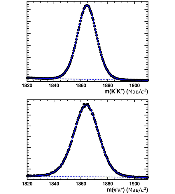 | Распределение пар каонов K+K– и пионов π+π–, регистрируемых в эксперименте. Пик распределений приходится на 1 865 МэВ/с2 — массу D0-мезона. (Иллюстрация LHCb Collaboration.) |