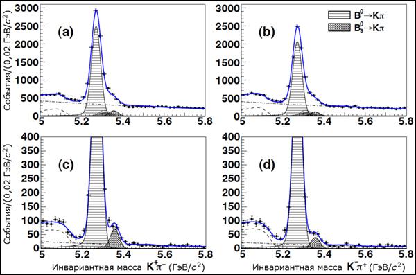 s-мезонов на каоны K и π, пытаясь найти следы прямого CP-нарушения. Суть такого эффекта состоит в том, что вероятность распада частицы в определённое конечное состояние расходится с вероятностью распада её античастицы в соответствующее состояние, полученное с помощью CP-преобразования. В нашем случае исследователям пришлось сравнивать процессы типа B0