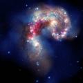 | Композитное изображение UGC 5189A, на котором рентгеновские данные «Чандры» выделены фиолетовым, а оптическая информация с «» — красным, зелёным и синим (иллюстрация НАСА / CXC / Royal Military College of Canada / P. Chandra et al; НАСА / STScI). |