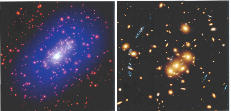 Рис. 1.7. Скопление CL0024+ 1654 [11]: синий цвет на левом рисунке иллюстрирует распределение темной материи; серповидные объекты голубого цвета на правом рисунке — множественное изображение галактики, расположенной далеко за скоплением