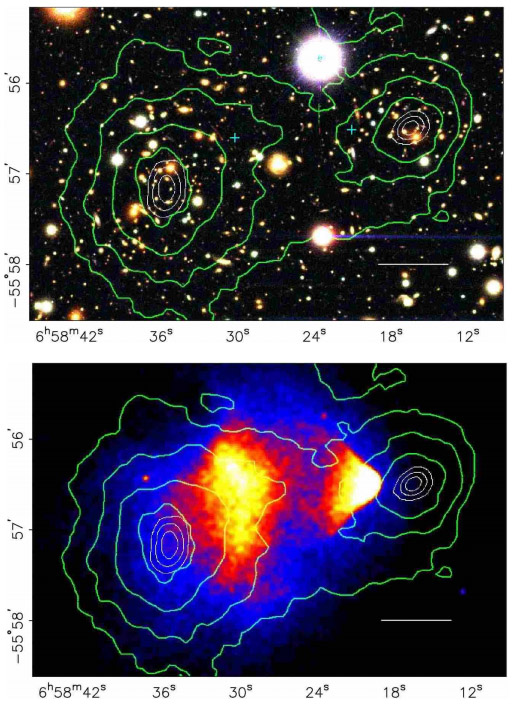 Рис. 1.8. Результат наблюдения [12] сталкивающихся скоплений 1Е0657-558: замкнутыми линиями показан гравитационный потенциал, в основном создаваемый темной материей, Светлые области на нижней диаграмме показывают распределение горячей плазмы, белым отрезком показан масштаб 200 кпк V сопутствующей системе (z = 0,296)