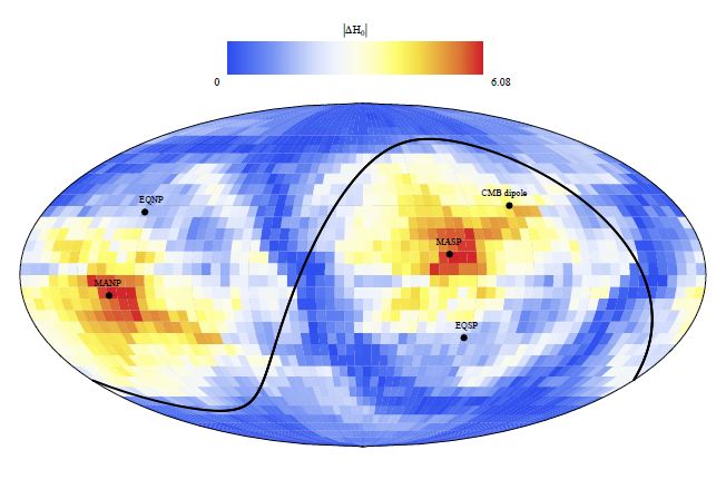 Рисунок показывает $\Delta H_0 \equiv H_0(\mbox{North}) - H_0(\mbox{South})$ в единицах $km \,s^{-1}\,Mpc^{-1}$. максимум соответствует асимметрии на уровне $5\%$.